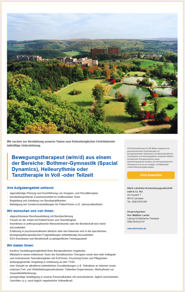 An der Klinik Lahnhöhe ist eine Stelle für einen Bewegungstherapeut (w/m/d) aus einem der Bereiche: Bothmer-Gymnastik (Spacial Dynamics), Heileurythmie oder Tanztherapie in Voll -oder Teilzeit offen.